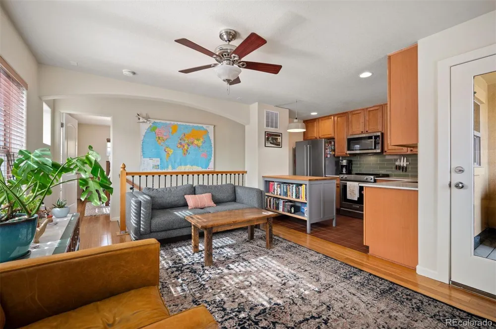 Welcome to refined, low-maintenance living in the heart of Central Park. Perfectly positioned just steps from neighborhood parks, the community pool, recreation center, and the vibrant The Stanley Marketplace, this sophisticated townhome offers the ideal blend of convenience and charm. With easy access to Downtown Denver, Cherry Creek North, and Denver International Airport, you’re truly connected to everything Denver has to offer. Thoughtfully updated throughout, this timeless residence welcomes you on the main level with a generously sized bedroom featuring a full en suite bath—perfect for guests, roommates, or a private office. You’ll also find laundry, additional storage, and direct access to the attached one-car garage. Upstairs, an open and airy living space unfolds. The remodeled kitchen makes a statement with quartz countertops, new stainless steel appliances, updated tile, and modern finishes completed in 2023–2024. The adjacent living room is warm and inviting, centered around a gas fireplace and filled with natural light, with seamless access to a private balcony ideal for grilling or relaxing outdoors. The upper-level primary suite offers a peaceful retreat with a walk-in closet and updated ¾ en suite bath. Both bathrooms showcase recent improvements including new vanities, designer lighting, tile work, custom mirrors, and luxury vinyl flooring. Additional upgrades include new carpet on the stairs and bamboo flooring installed in 2022. Stylish, move-in ready, and located in one of Denver’s most beloved communities—this Central Park townhome is the perfect place to call home.